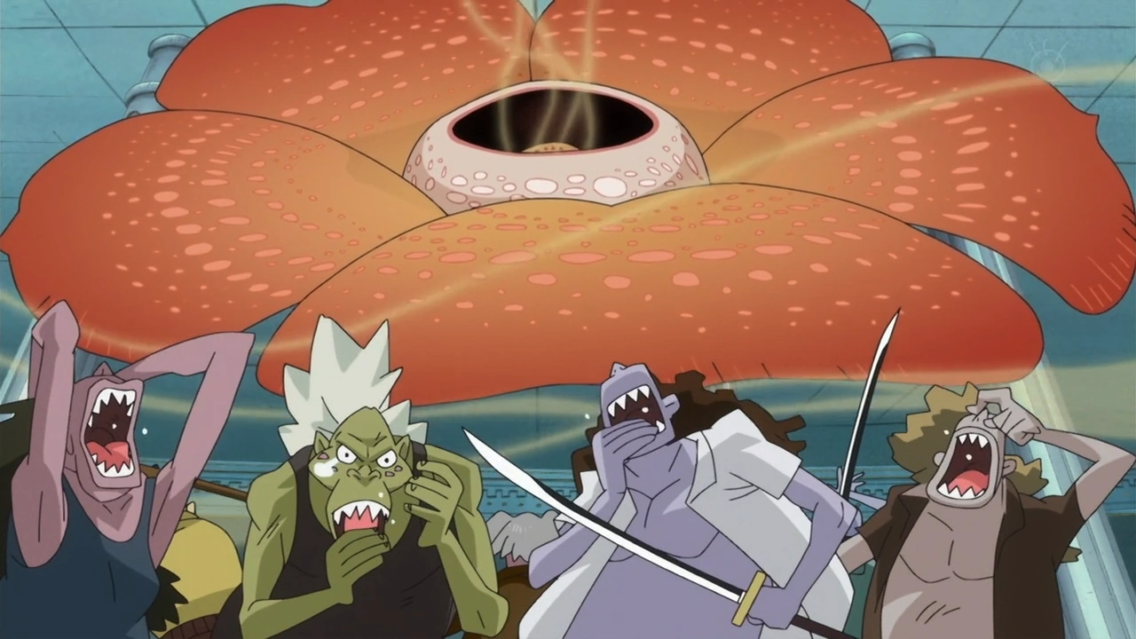 ↑One Piece Манга и Аниме — Том 63Глава 617 и Эпизод 536, Усопп использует "Rafflesia" против Ходи Джонса и его рыболюдей.