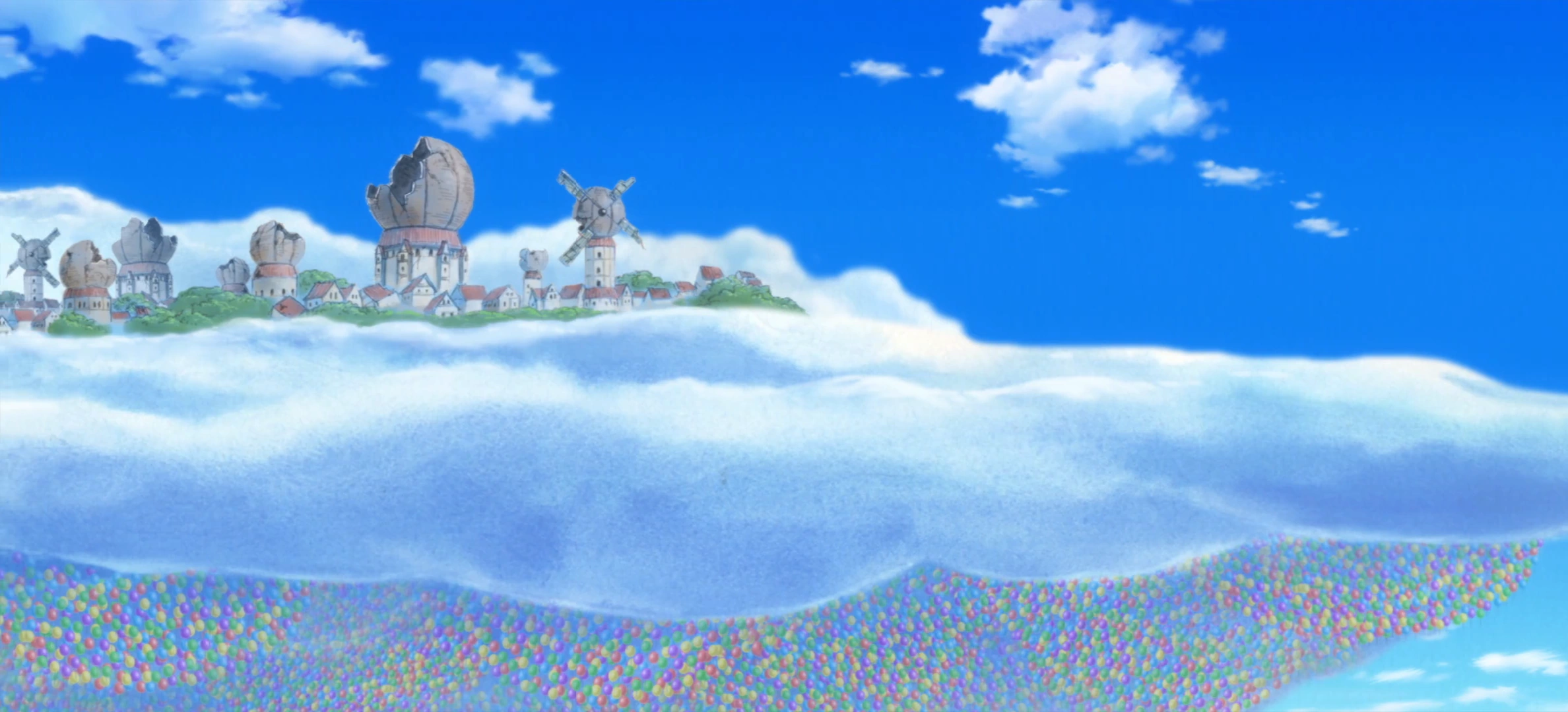 Данный небесный остров по-видимому как минимум частично поддерживается множеством воздушных шаров, расположенных вдоль его нижней стороны. Он находится на высоте 10 000 метров прямо над базой Пиратов Кида[2]