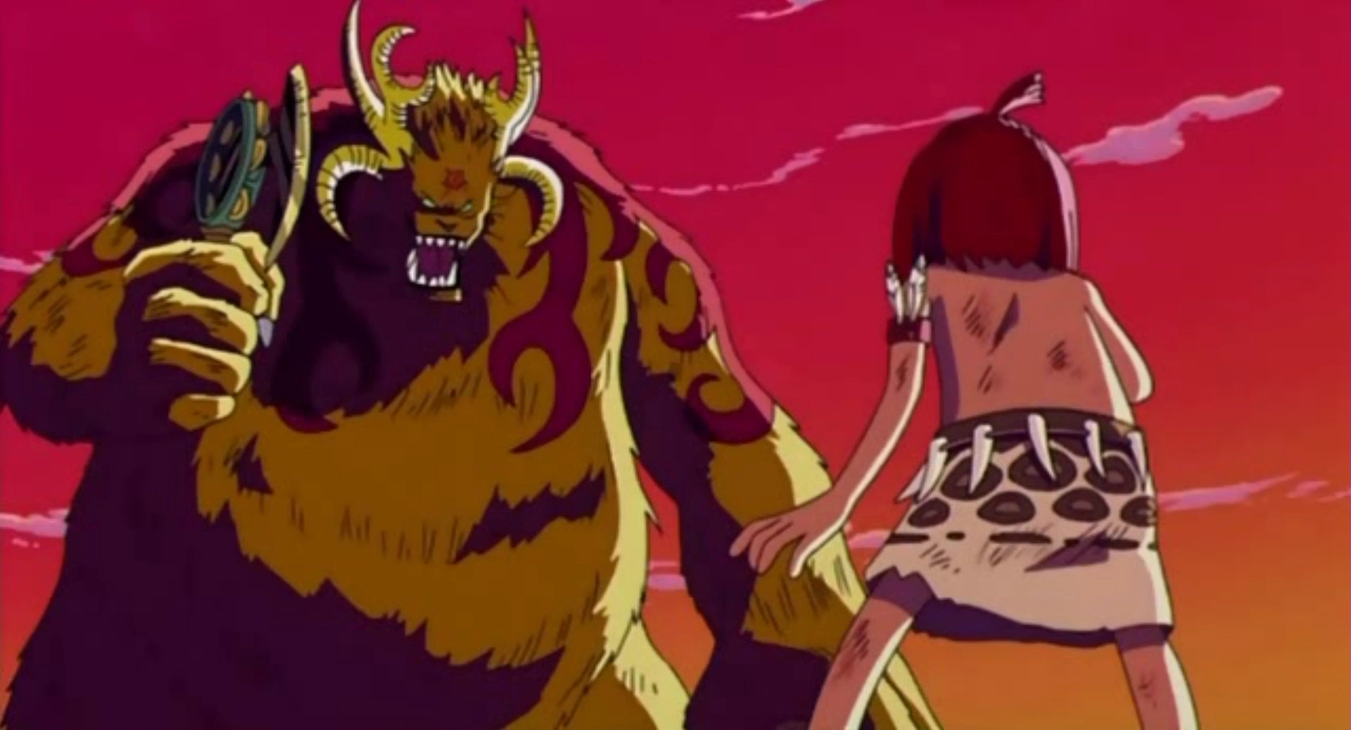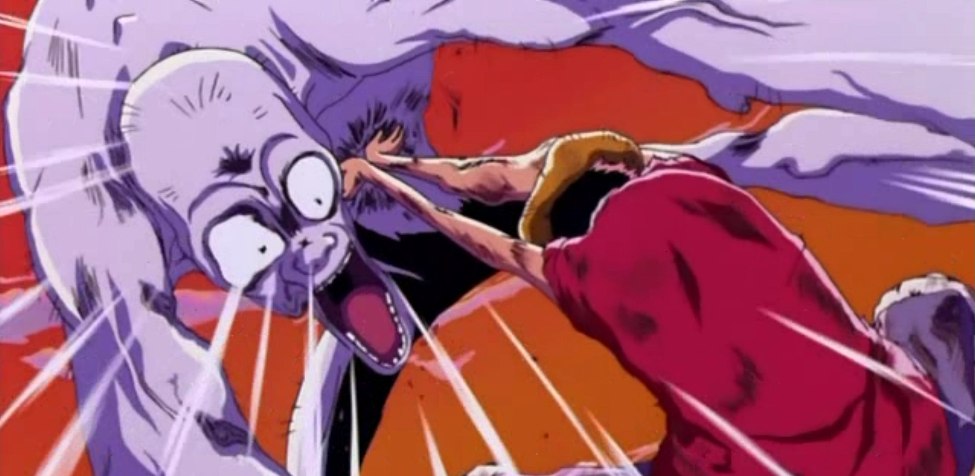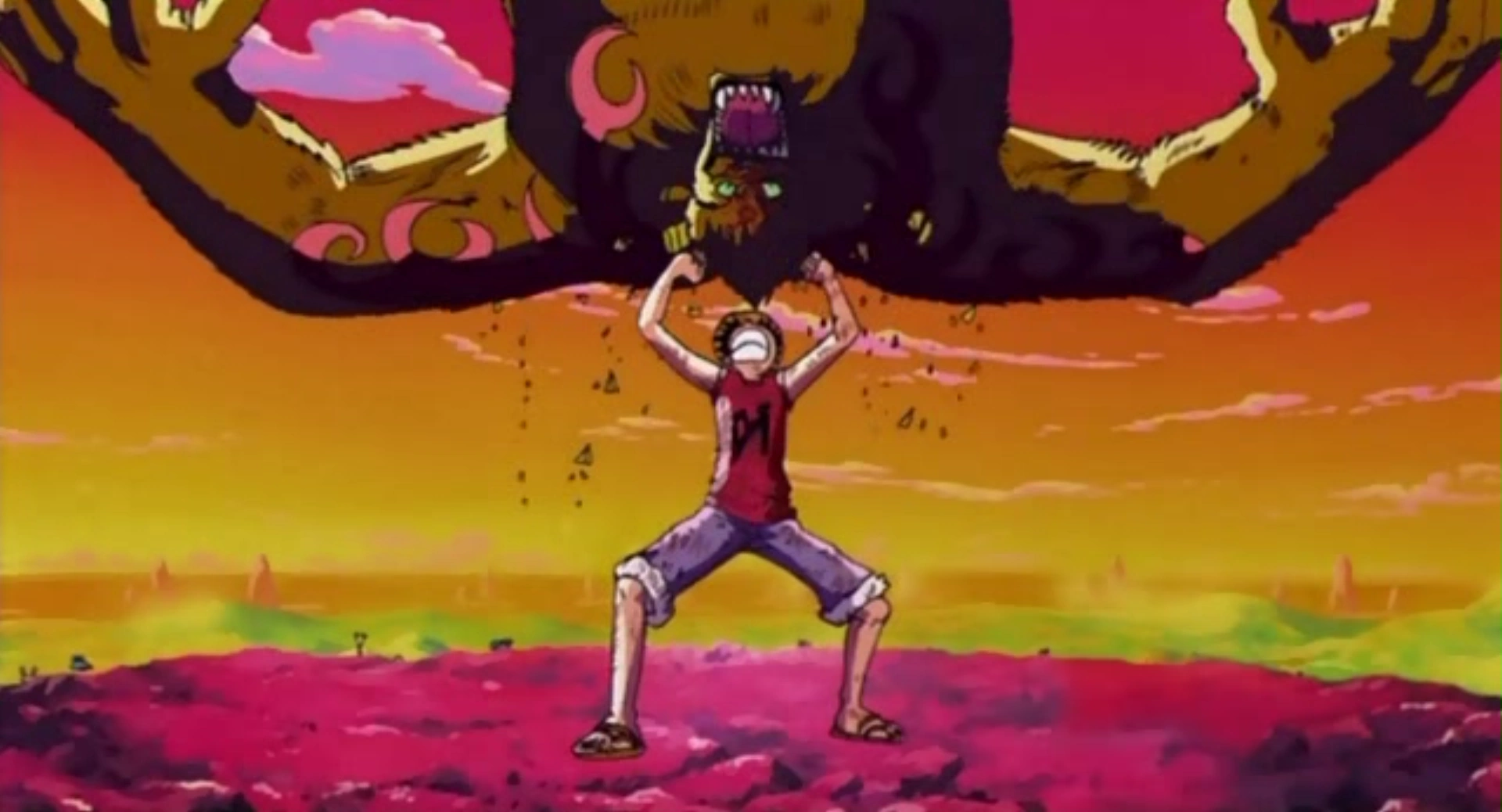 Из-за крика Мобамби, множество животных появляются вокруг горы и направляются в сторону Батлера. Увидев их, Батлер ударяет рогами по земле, раскалывая её на части и останавливая толпу зверей. Вдруг неожиданно, после того, как он завершил свою атаку, перед ним вновь появляется мугивара Луффи, который нанеся по нему удар кулаком, начинает атаковать его тело «Gomu Gomu no Gatling», но не смотря на это, Батлеру это не принесло никакого урона. Посмеявшись над ним, он атакует Луффи раскалёнными рогами, однако тот останавливает их, после чего подняв их, вместе с Батлером над головой ломает их.