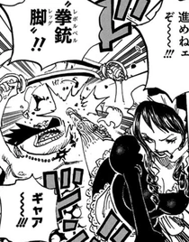 После начала битвы в финальном блоке Колизея Корриды, ей доложили о проникновении Луффи на территорию королевского дворца, она решила, что это ошибка, так как Мугивара сражался на арене под псевдонимом «Луси», однако ей повторно сказали, что это не ошибка, заявив что на них действительно напали Луффи, Зоро и Виолетта.[31]
