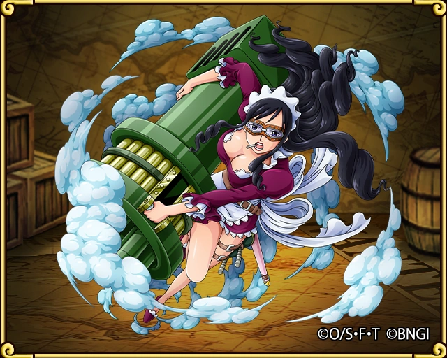 Во время её прибытия на Панк Хазард с Баффало она носила летательные очки, которые начинали заполняться слезами, когда она плакала.[6] Также тогда у неё было новое оружие: большой огнемёт и большой пулемёт.