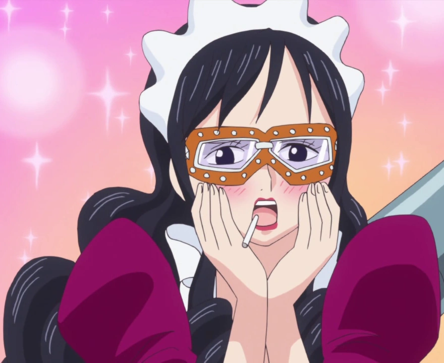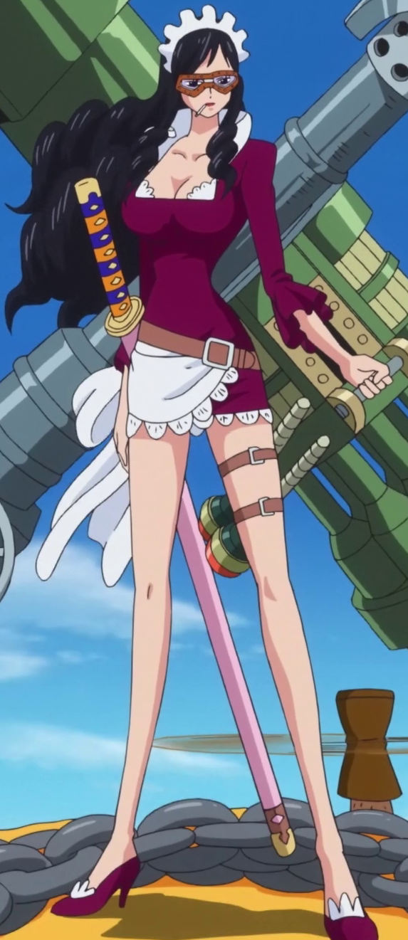 Узнав о гибели своего восьмого бойфренда, она выпрыгивает из окна королевского дворца, встав на против Дофламинго, преобразовав свою руку в пистолет и взяв его на мушку, во время его разговора с Верго. Видя, что тот не смотря на её действия никак не реагирует, она выстреливает в него, однако у неё не получается нанести ему урон. Видя его безразличие в её сторону, она пытается отрубить ему голову, преобразуя руки в косы, но тот с лёгкостью уворачивается. Заметив её действия, Гладиус стреляет в неё из пистолета, после чего Махвайс просит её успокоится и не доставать «Молодого Господина», однако она игнорирует его слова, желая убить своего капитана. Быстро придя в себя, она преобразует руки в топоры, которые она безрезультатно использует против него. Однако перед очередной её атакой, Дофламинго, продолжая спокойно говорить по Дэн Дэн Муси, берёт её тело под свой контроль, заставляя её приставить её руку-пистолет к её голове.[1]