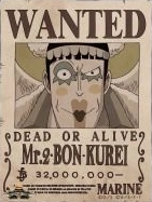 Когда Мугивары встречаются с Кару и Супер Отрядом Пестроносых Крякв, они врываются в Алубарну. Позднее, в столице королевства Алубарне, когда команда Соломенной Шляпы одевается в плащи, чтобы скрыть свои личности и, притворившись Виви, отвлечь агентов, Бон Курей первыми встречает Усоппа и Ресничку.[22] Он легко побеждает их за несколько секунд и, надев украденные снайперские очки Усоппа, Мистер 2 пытается в облике Усоппа обмануть Виви. Благодаря плану, который команда Соломенный Шляпы придумала, чтобы проверять истинность члена команды, Виви легко раскрыла его и вместе с Кару пустилась наутек,[23] заняв его достаточно для того, чтобы Санджи пришёл к ним на помощь.[24]
