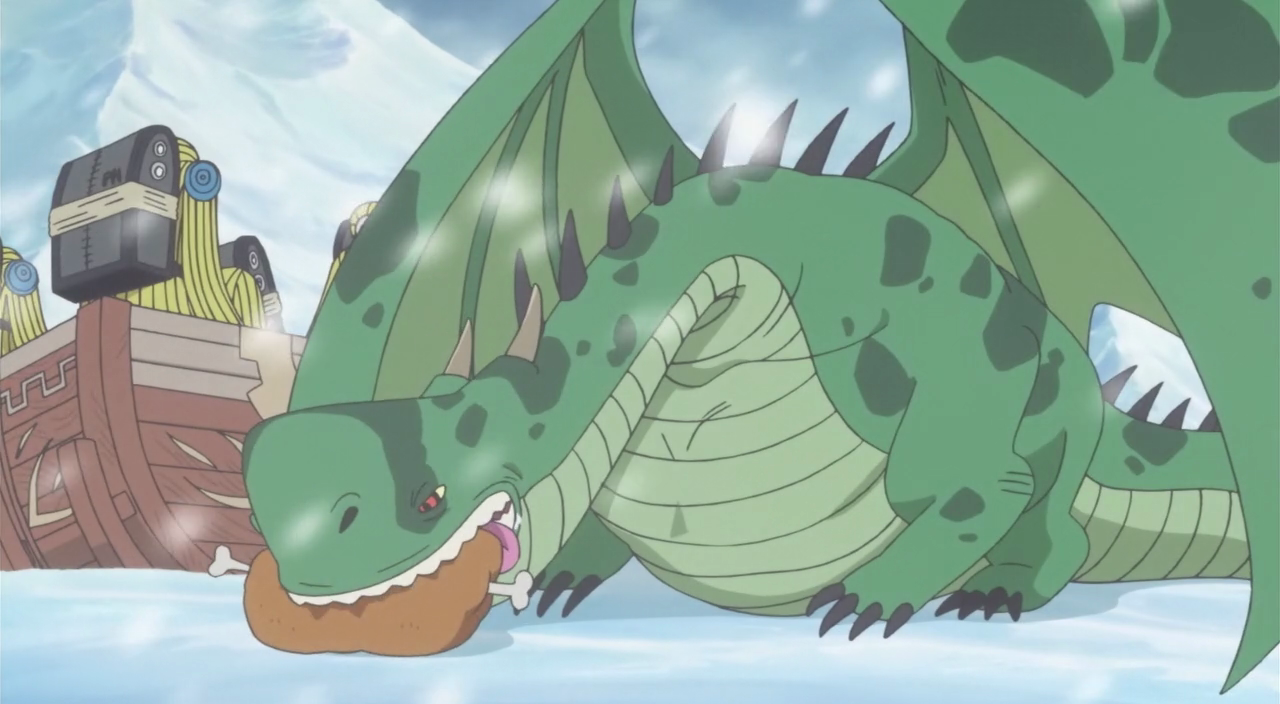 Дракон (竜(ドラゴン) Doragon?) — Пираты Соломенной Шляпы столкнулись с двумя экспериментальными разновидностями дракона на первом острове, который они посетили в Новом Мире.[2] Все они являются частью исследований Вегапанка.