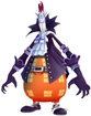 По бокам его лба имеются два рога, а также от подбородка идёт крестообразный шов, который продолжается и по всей его шее, очень длинной и толстой, в сравнении с телом. Его уши и зубы заострены[11], а верхняя часть его тела кажется очень тонкой и длинной, в сравнении с круглой и коренастой нижней частью туловища[12].