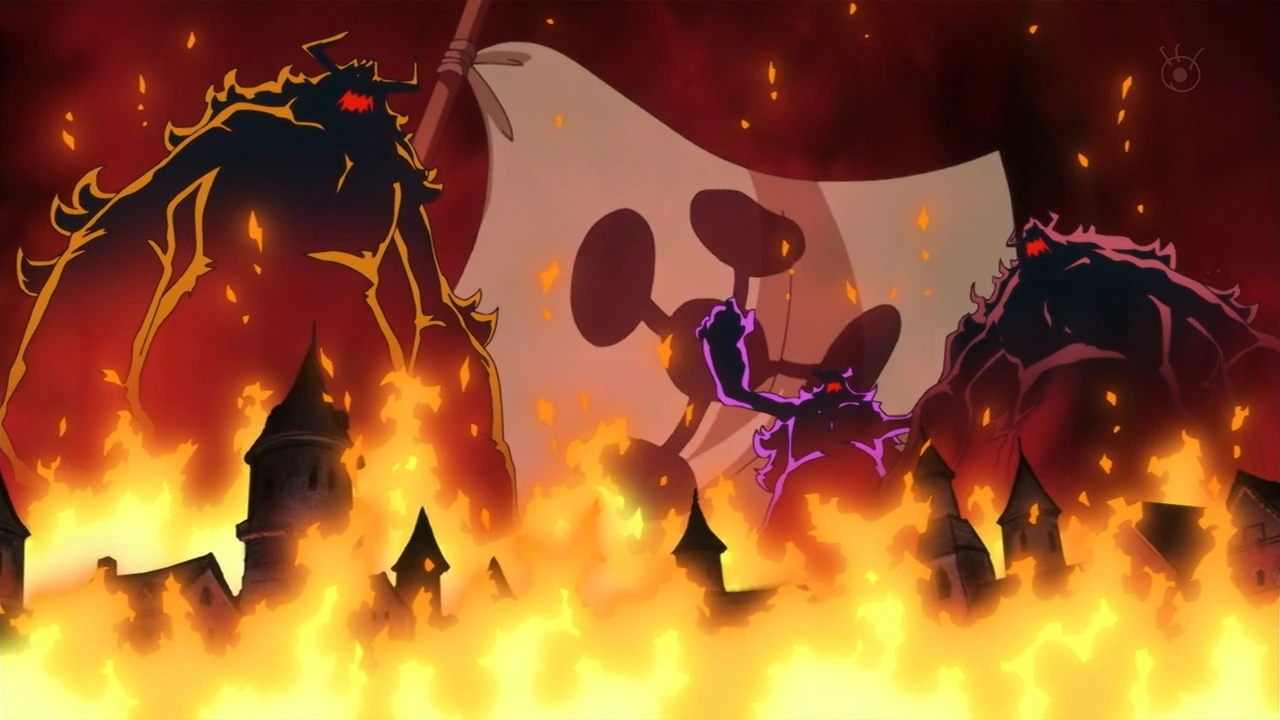Глава 657 (стр. 16-17) и Эпизод 582, Пираты Соломенной Шляпы сталкиваются с гигантскими детьми в лаборатории Цезаря.