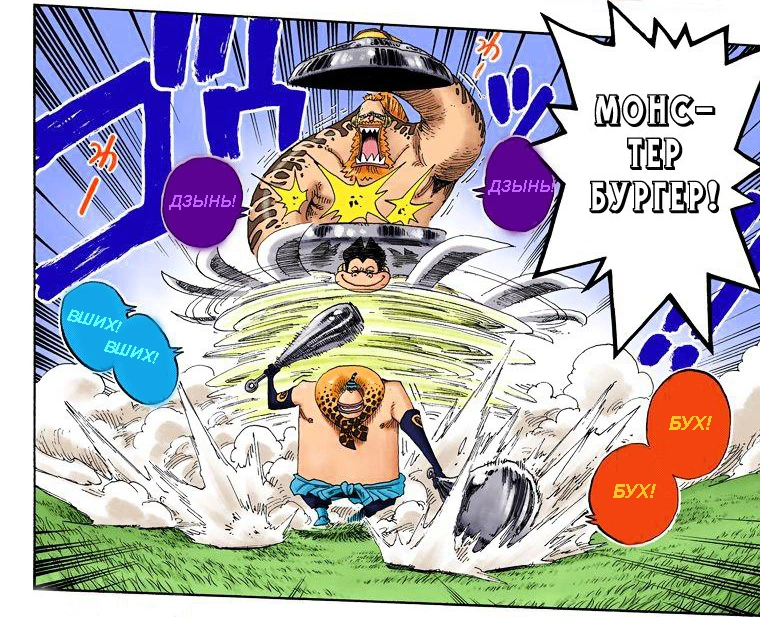 Продолжается второй этап Раздачи Дэйви. Ведущий объявляет о том что команда Пиратов Соломенной Шляпы практически проиграла. Но тут Зоро и Санджи, поднимаются. Это приводит в восторг команду и публику. Фокси просит "один монстр бургер пожалуйста", чем удивляет всех. После этого Гамбург достает из своих штанов две большие стальные дубинки, Пиклз же в свою очередь достает две сабли, а Биг Пан пресс. Все трое встают в стойки готовые одолеть Зоро и Санджи. Ведущий поясняет, что Монстер бургер - это самая мощная и опасная атака тремя оружиями. Но судья "совершенно случайно" смотрит в противоположную сторону, не замечая явное нарушение правил. Чем сильно разозлил Луффи, но тот был остановлен Усоппом.