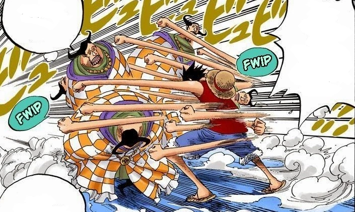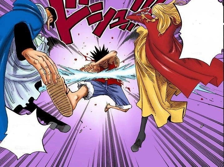 Вот вот должен был начаться пожар, виновными в котором для всего города будут Пираты Соломенной Шляпы. Пираты тут же возмутились этому, и Нами даже уверила агентов, что то, что они прикрываются другими людьми, чести им не делает. Однако агентов CP9 эти слова не могли задеть, потому что, по их мнению, и так испорченную репутацию пиратов уже ничто не может испортить. Всё ближе был момент взрыва, и Робин решила отправиться первой, направляясь к окну. Мугивары тут же начали просить её остановиться, однако она не останавливаясь. Луффи тут же рванул вперёд, намереваясь остановить накама, однако на пути у него встал Блюно. Пират тут же атаковал его, однако агент СР9 использовал Тэккай, чтобы выдержать все удары пирата, укрепляя свою кожу до уровня прочности стали. В приступе раздражения Луффи попытался снова атаковать Блюно, однако тот использовал Ками-э, уклоняясь от атак с невероятной скоростью. Чоппер и Нами не могли поверить своим глазам, наблюдая за тем, как огромный Блюно с лёгкостью уворачивается от многочисленных атак их капитана. Не желая больше ждать, Луффи снова попытался ударить Блюно, но тот прости исчез, используя Сору, возникая прямо за спиной Луффи, а затем использовал Геппо, отталкиваясь от воздуха как от земли поднимаясь при этом в воздух.