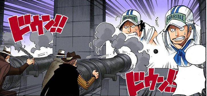 Капоне Бэдж, который благодаря силе своего дьявольского плода стал человеком крепостью, отбивается силой своих подчинённых, которые живут в его теле - крепости, от нападающих дозорных. Задавленные количеством противников и неожиданностью их появления, Дозорные проигрывают. В 24 Роще Арудж сражается якобы с Бартоломью Кумой, а Бэзил Хокинс сталкивается с адмиралом Кидзару, демонстрируя свои странный способности. Кидзару же в борьбе использует свет. Вскоре на поле боя оказываются также Арудж и X Дрейк. С крыши за боем наблюдет Скретчмен Апу. Пираты Соломенной Шляпы сталкиваются с ещё одним Кумой, который атакует совсем не так как прежде. За всем этим наблюдает Сэнтомару, предсказывающий, что так от пиратов не останется и мокрого места.
