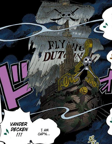 Неожиданно из темноты появляется корабль-призрак. Брук с ужасом узнаёт в этом корабле Летучий Голландец, капитаном которого по легенде был некий проклятый богами Вандер Деккен, который был обречён скитаться за свои грехи в пучинах моря вечно, и сейчас то самый корабль был прямо перед ними. Некий человек на борту корабля приказал Умибозу разобраться с кораблём, и тот не долго думая тут же размахнулся, чтобы нанести удар по Таузенд Санни. Топливо кончилось и Мугивары не могли удрать при помощи скачка, однако неожиданно появился Кракен и сбил с ног Умибозу, нанося множество ударов. Кракена своим приказом остановил Луффи. Вскоре в зоне видимости появились Санджи, Зоро и Луффи в пузыре, а вскоре они уже были снова на своём корабле. Радость от встречи была прервана начавшимся извержением вулканов.