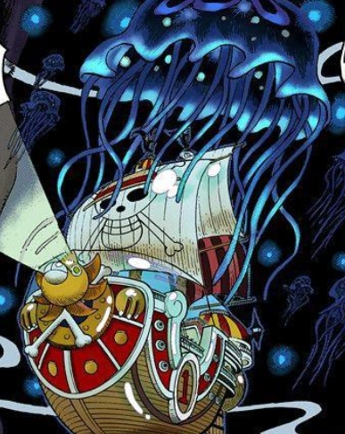 Пираты Соломенной Шляпы пытаются найти своих накама на дне океана, но там слишком темно, чтобы у них это легко получилось. Во круг корабля плавают огромные светящиеся медузы, щупальца которых проникли внутрь пузыря Таузенд Санни. Чоппер хочет дотронуться до одного из них, но Робин успевает предупредить о том, что щупальце скорее всего ядовито. Вскоре оказывается, что она была права.