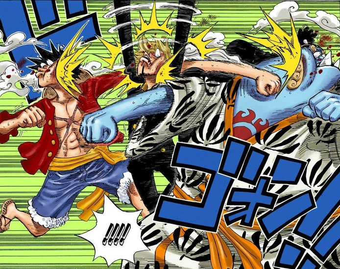Санджи пытается спасти Робин, но вместо этого попадает между Луффи и Дзимбэем в момент их драки.