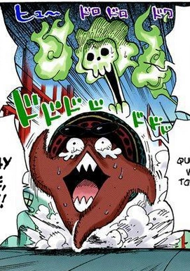 А в это время дух Брука, который теперь может отделяться от тела, сообщил Зоро и Усоппу, которые всё ещё закованные в цепи и сидящие под потолком комнаты, заполняющийся водой, в клетке, что все рыболюди покинули дворец за исключением нескольких солдат, а кроме того, они оставили Паппага. Усопп отмечает, что новая способность Брука соответствует настоящему мертвецу, Брук соглашается с этим и рассказывает, что однажды он немного помолился и его душа просты вышла из тела. Теперь его душа может проходить сквозь стены и делать много чего ещё… Усопп попросил Брука найти во дворце Паппага и попросить его найти ключ от клетки и наручников, а так же открыть затвор, который закрывает их в этой комнате. Зоро же отметил, что если Паппаг принесёт хотя бы один меч, то этого уже будет достаточно. Брук, найдя Паппага, пытается попросить его найти ключ и спасти их или хотя бы просто найти один меч Зоро, однако Паппаг слишком напуган видом Брука в виде приведения, чтобы понять, что тому от него нужно.