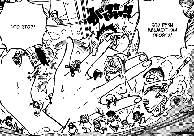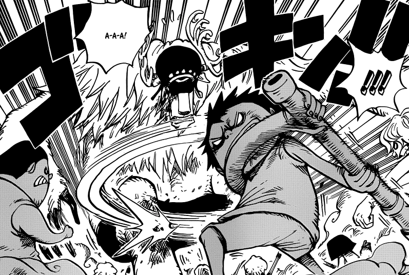 - Луффи проваливается в подвал во время сражения с Моне, которая затем отправляется в "Бисквитную Комнату".