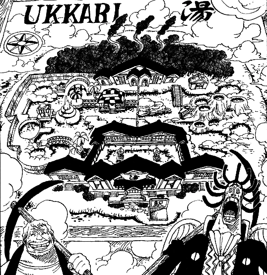 После своего поражения Гэдацу падает с небес на землю, усеянную странными отверстиями и как выяснилось позже это был остров горячих источников Уккари. [6] Там он встречает Горо, старого человека, живущего на этом острове, [7] к которому он приходит, чтобы жить с ним и соглашается ему помочь построить курорт с горячими источниками этого острова. После большой работы, в парк приходит Земляной Босс, [8] которого побеждает Гэдацу, [9] чтобы можно было снова приступить к созданию новых туннелей. [10] Когда они продолжают копать, то обнаруживают горячую воду, [11] однако в этот момент появляется Лесной Босс, который категорически против строительства их туннеля, и Гэдацу также его побеждает. [12] Как выясняется один из туннелей вёл в Алабасту, [13] и как показали Горо оказывается был дядей Козы. [14] Когда они возвращаются на Уккари, побеждённый Лесной Босс заканчивает строительство курорта. [15] В конечном итоге, Гэдацу решает остаться на этом острове и работать там в качестве клерка, к собственному (возможному) шоку, [16] и в связи с этим счастливым происшествием, Гэдацу оканчивает свою службу жреца сразу после того он был сослан с облаков в пустыню, когда Энель потерпел поражение.