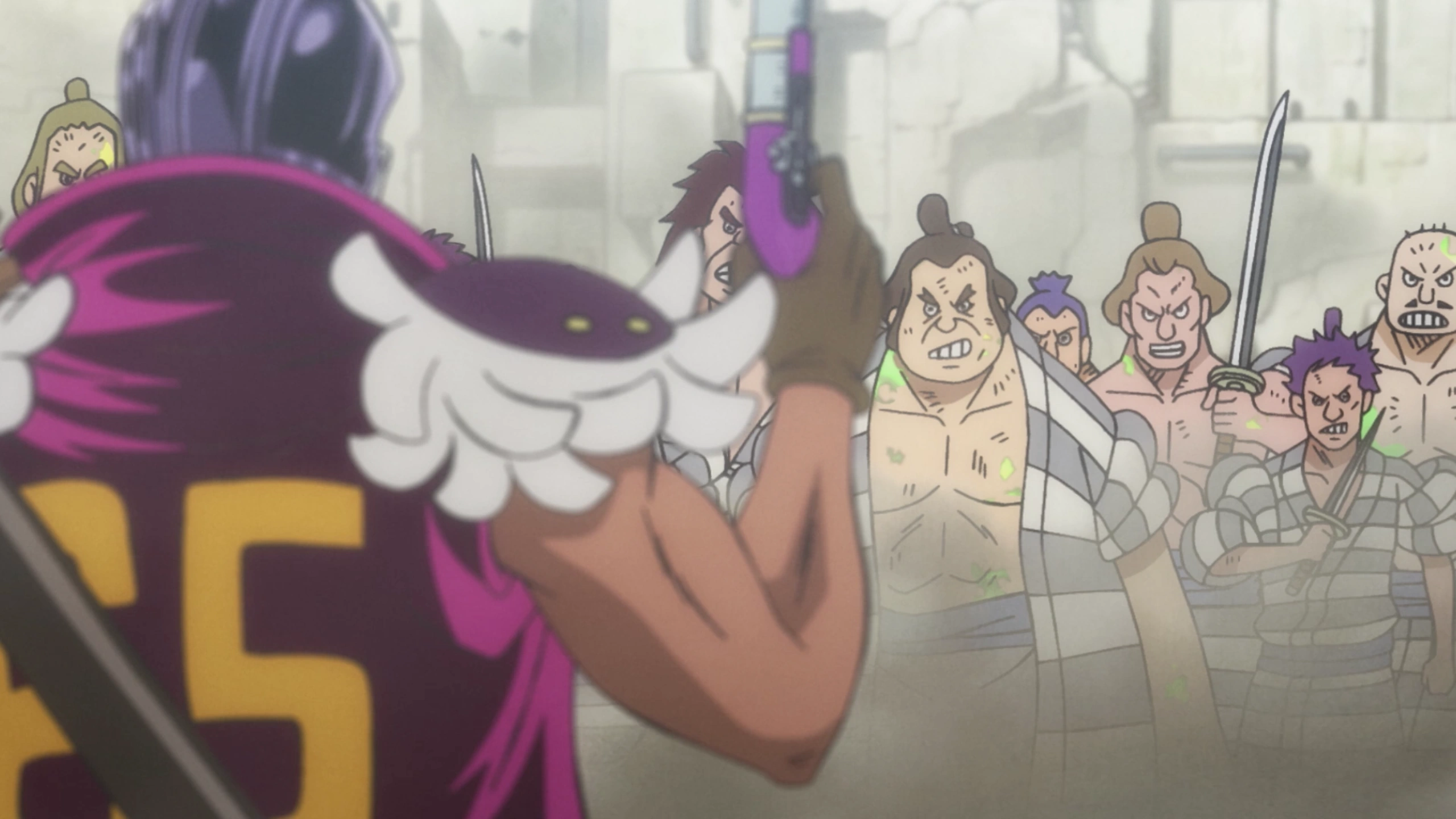 Дайфуго пугается, увидев, что заключённые, в которых Луффи зажёг дух восстания, собираются его избить.