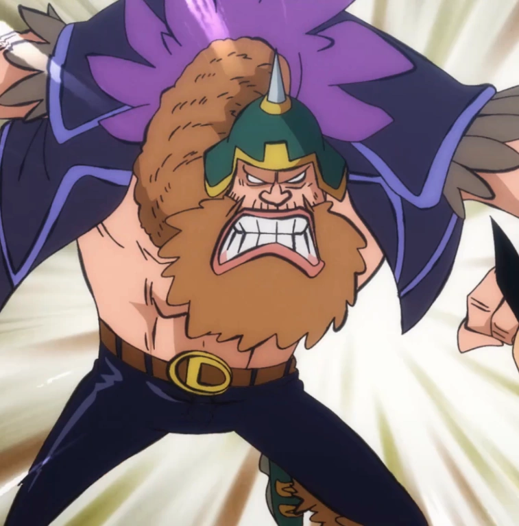 В своей дебютной сцене в аниме, его дизайн больше напоминает его дизайн в манге. Однако в сцене боя с Луффи его дизайн несколько изменился, например, его шлем имеет только один шип наверху и у него отсутствуют наплечники.[1]