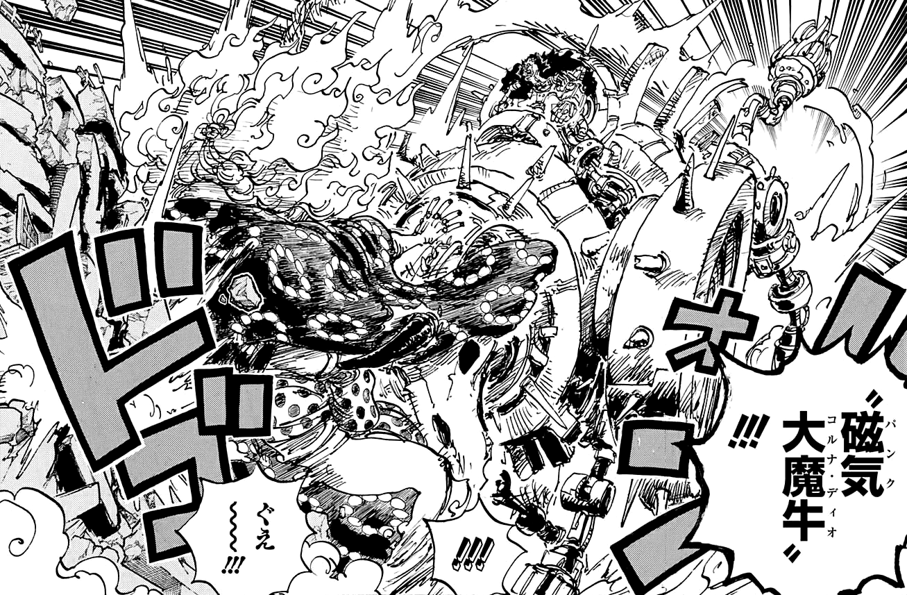 磁気 大魔牛 Панку Коруна Дио?, дословно означает "Магнитный великий демон-бык"): Кид собирает большое количество металлических частей из своего окружения и формирует их в виде гигантского металлического приспособления, похожего на быка, которое даже больше, чем Большая Мамочка увеличенная до гигантских размеров. Затем, катаясь на его спине, Кид заставляет быка броситься на своего врага, чтобы он мог ударить его головой. Впервые эта атака была использована против Большой Мамочки,[28] и была достаточно сильной, чтобы повредить её кости.[29] Corna по-итальянски «рога», а также знак рукой в рок-культуре, популяризированный Ронни Джеймсом Дио.