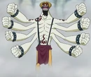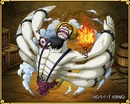 Он владеет восемью копьями, так называемые «Сухокальмарные копья» (スルメイカの槍 Surume Ika no Yari?), держа их по одному в каждой из рук. По видимому он является специалистом в их использовании, и даже выступая в одиночку против множества врагов, он способен одержать верх над ними. Остриё копья на самом деле кальмары, которые высасывают всю жидкость, из любого, кого они атаковали.