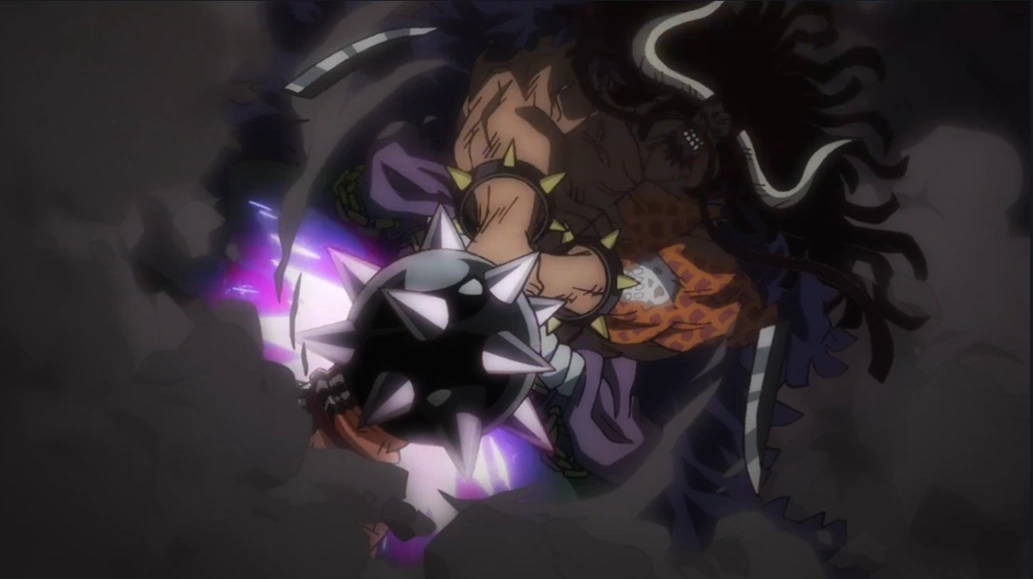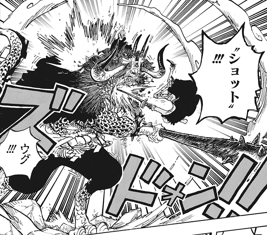 Глава 1009 (стр. 12) и Эпизод 1025, Кайдо пробивает хаки вооружения Луффи своим хаки.