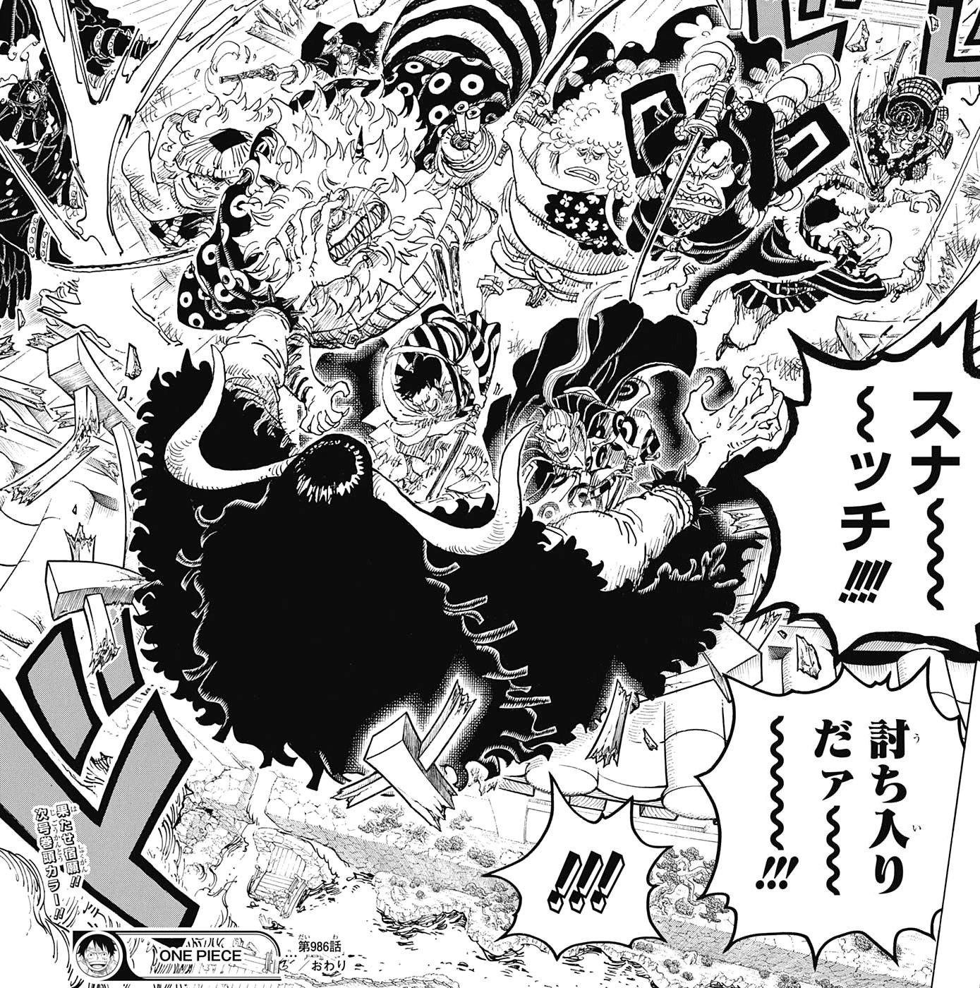 Глава 994 (стр. 2-5), Кайдо возвращается в человеческую форму во время боя с Ножнами.