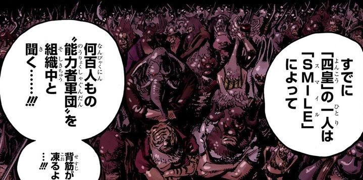 Когда попытка спасения Дофламинго провалилась, а весть о разрушении фабрики SMILE добралась до него, Кайдо напился и стал оплакивать эти события. В тот момент он проявлял сочувствие к Дофламинго, хоть и также назвал его слабаком. Кроме того, Кайдо поклялся отмстить главным виновникам этих событий, Луффи и Ло.[55]
