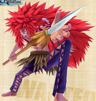 Он носит зашнурованные фиолетовые штаны (похожие на те, что носили Коренные Американцы) под юбкой из листьев.