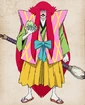 После этого Кандзюро поселился в Киби, воруя человеческие волосы у людей, мертвых и живых, чтобы делать кисти и продавать их, чтобы заработать на жизнь. Позже он встретил Одена и попытался украсть его волосы, но быстро проиграл ему. После своего поражения от рук Одена Кандзюро стал следовать за ним.[24] После того, как Оден стал дайме Кури, Кандзюро стал одним из его вассалов.