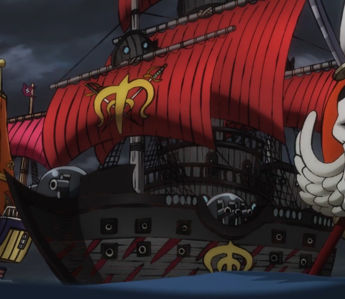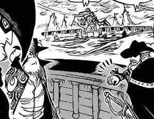 Глава 581 (стр. 2-3) и Эпизод 490, Пираты Дрейка в море недалеко от Маринфорда на Либерал Хайнде.