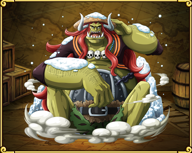 - Его корабль можно увидеть рядом с другими кораблями союзными с флотом Белоуса.[10] Его веселый Роджер это череп напоминающий его лицо, с массивными рогами, кости пересекают его крест накрест, как у Пиратов Белоуса.