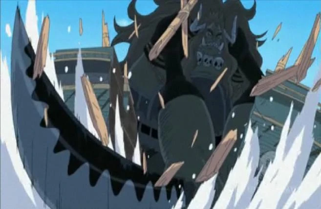 - ↑ One Piece Манга — Том 58 Глава 564, Little Oars Jr.'s body and blood stop the Marines' siege wall from raising up fully.