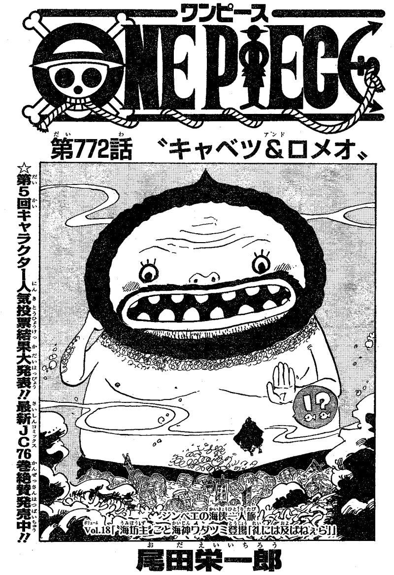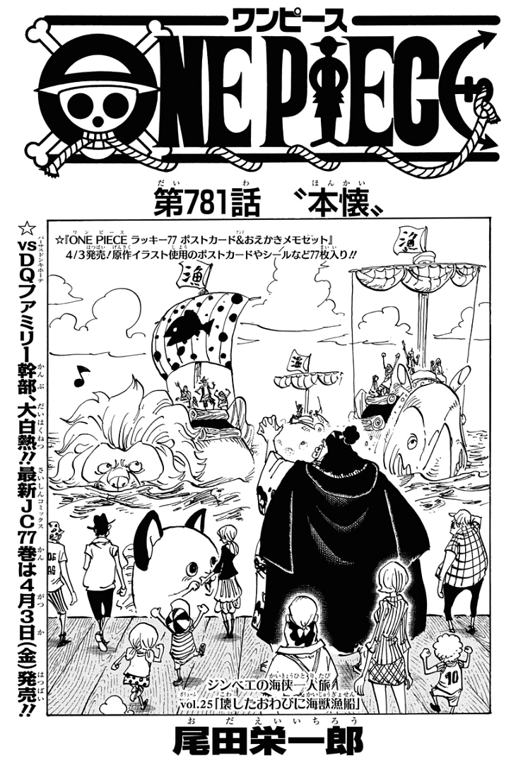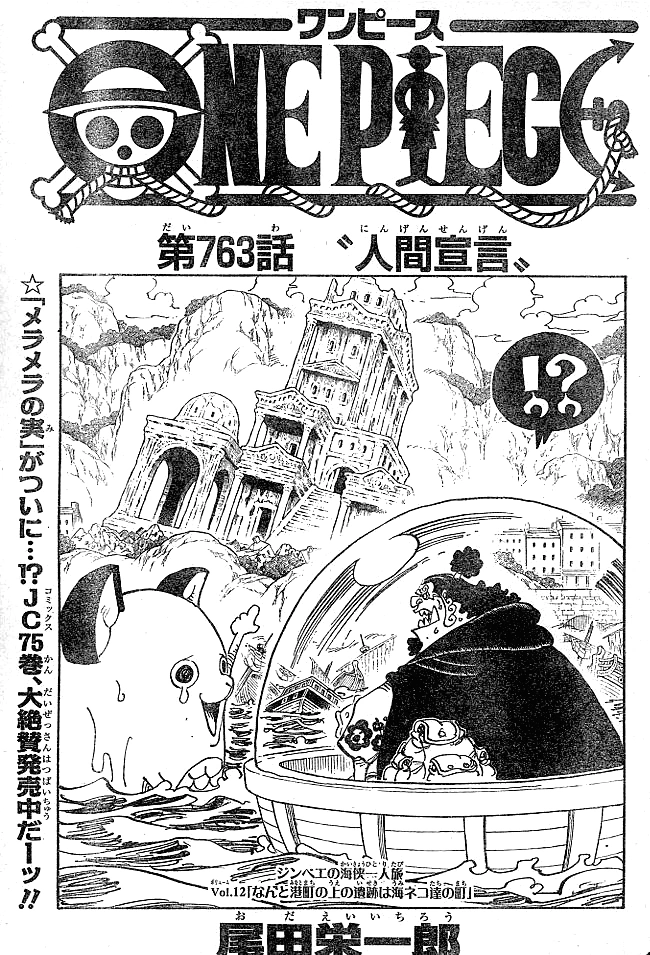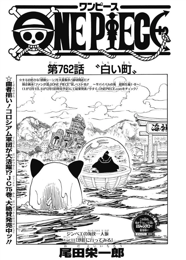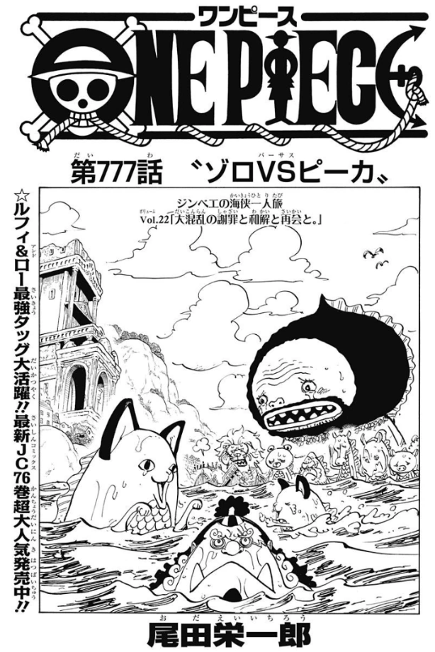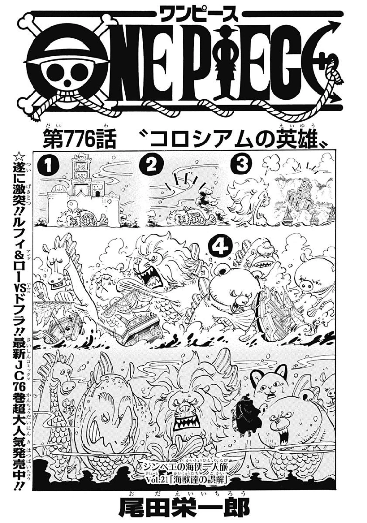 В поиске улик, которые объяснили бы им что произошло, шериф находит свой разрушенный дом. Тем временем, морской котенок и Дзимбэй заметили неподалеку тонущий корабль. К счастью, Дзимбэю удается поднять его обратно на поверхность, что спасло всех пассажиров корабля. После спасения корабля, Дзимбэй попросил у людей газету, из которой узнал об Альянсе Пиратов Соломенной Шляпы и Пиратов Сердца. Продолжая читать газету, он увидел статью о нападении морских чудовищ на город.