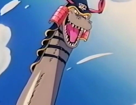 Как следует из названия, он является огромным плезиозавром. Он носит на голове японский шлем Кабуто синего цвета с жёлтыми краями и эмблемой пиратов Ганзака. К шлему прикреплены розовые клешни краба.
