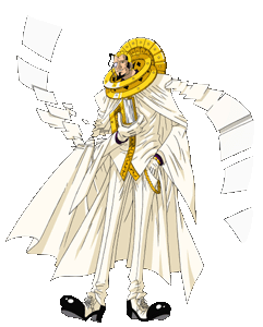 Саймон носит сложный, чисто-белый костюм с золотым ободом и накидкой, служащей украшением к его костюму и фиолетовую рубашку под его костюмом. Саймон носит монокль на правом глазу, а также толстые, золотые кольца на шее. На голове у него, что-то похожее на золотой шлем. Он носит отполированные до блеска чёрные туфли, а также тослтую книгу с золотым переплётом в руках.