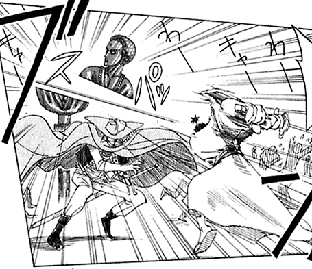 - ↑ Wanted! Monsters (p. 114-115), Рюма бросает вызов Сирано после прикосновения их ножен.