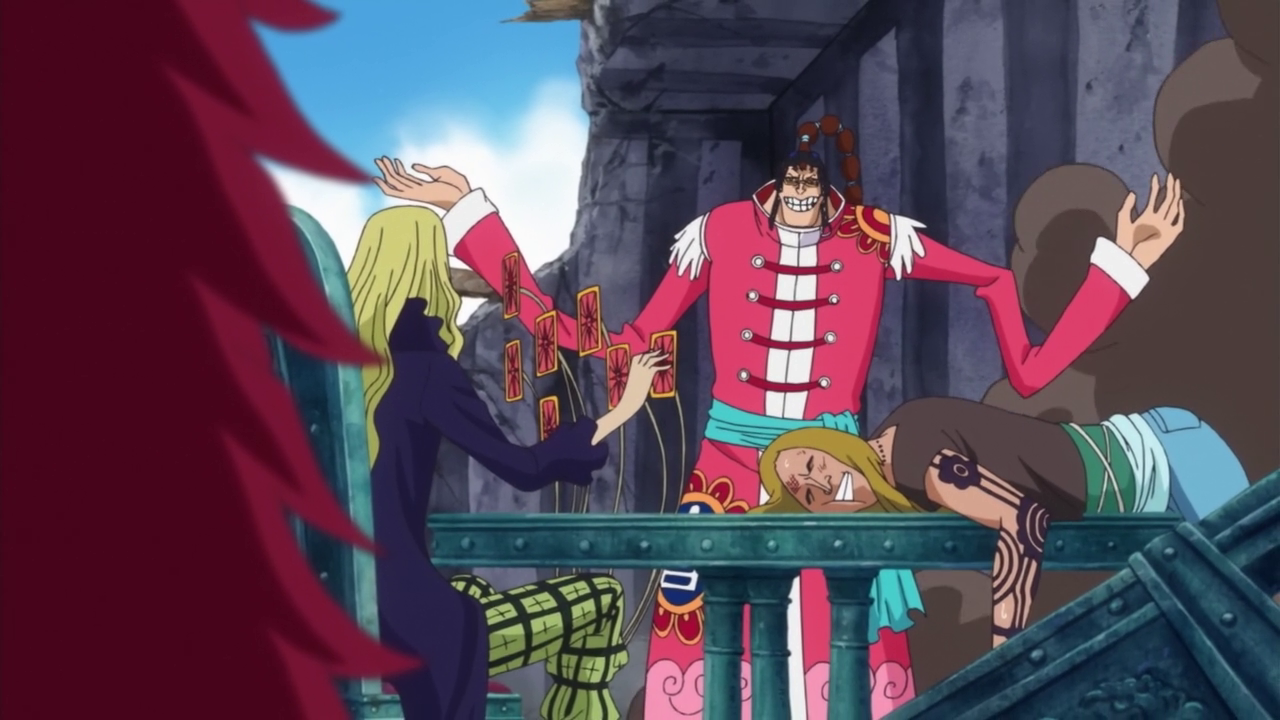 Глава 795 (стр. 10-17) и Эпизод 739, Альянс Апу, Кида и Хокинса сталкивается с Кайдо.