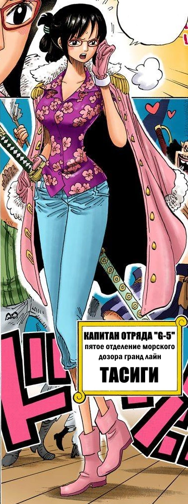 - Тасиги это вторая представленная в манге женщина из Морского Дозора. Первая — Белл-мере ушедшая в отставку и погибшая от рук Арлонга.
