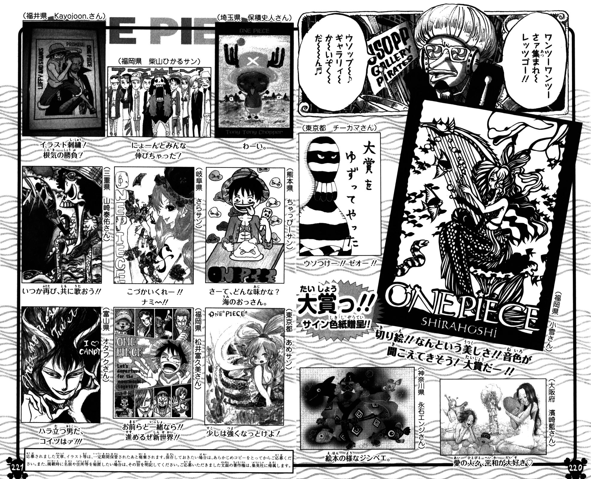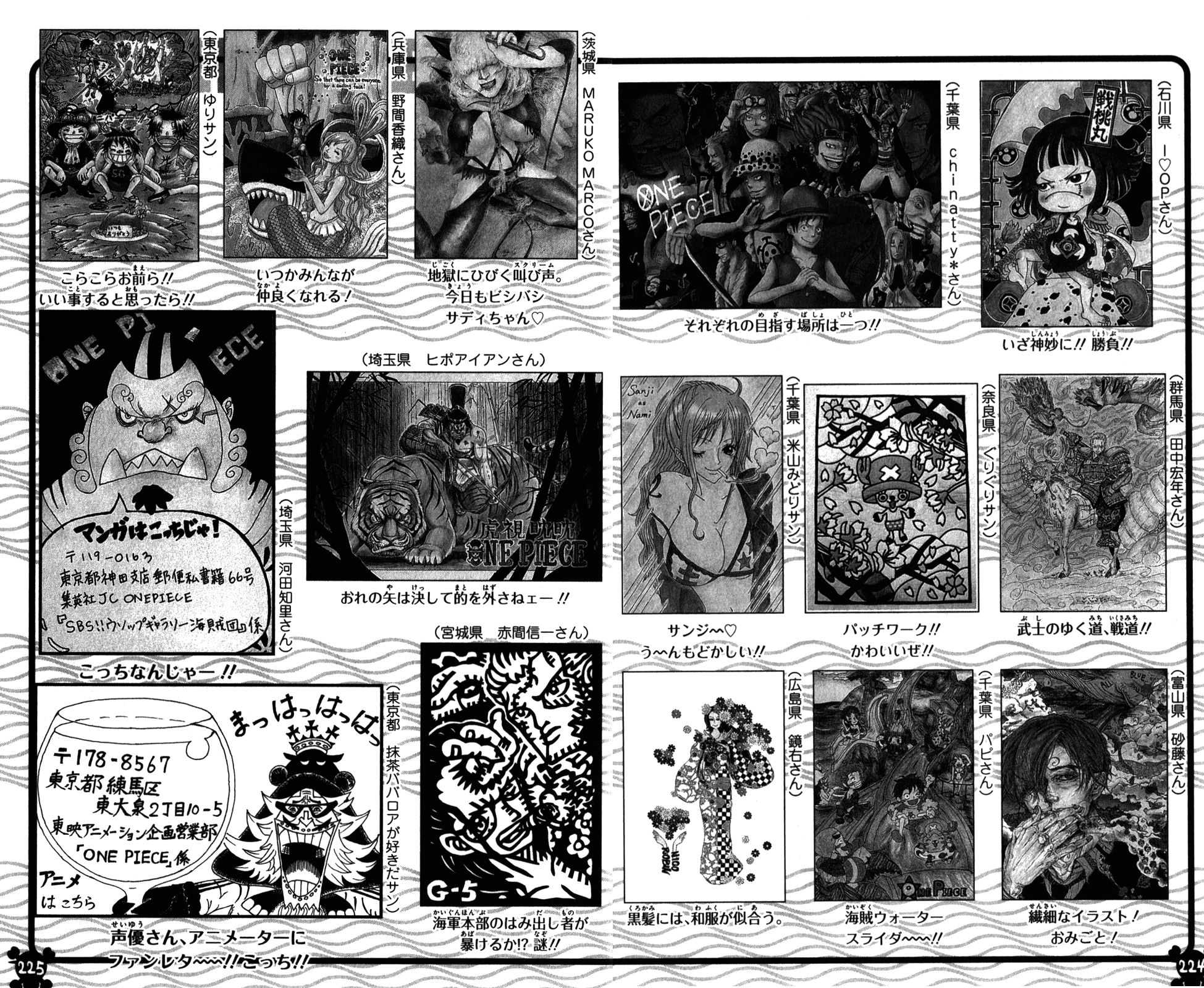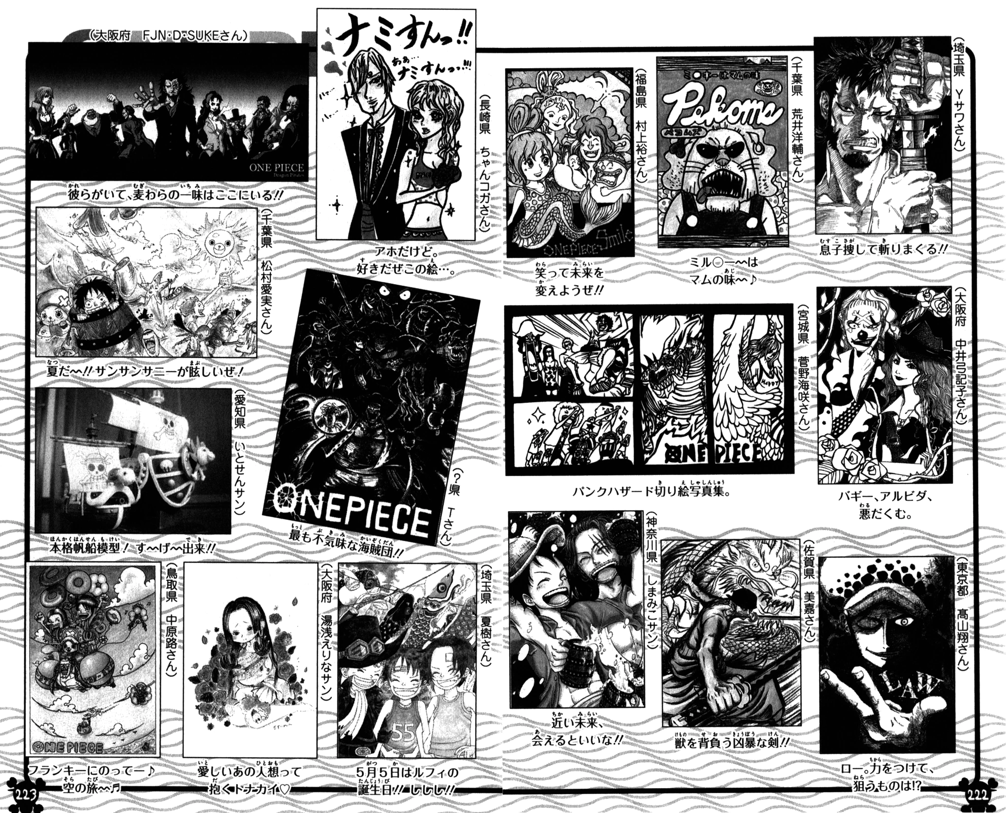 - Озаглавленный Сегмент раскраски [ぬり絵コーナー] — версия раскраски постера с Мугиварами в из костюмах со страницы 200.
