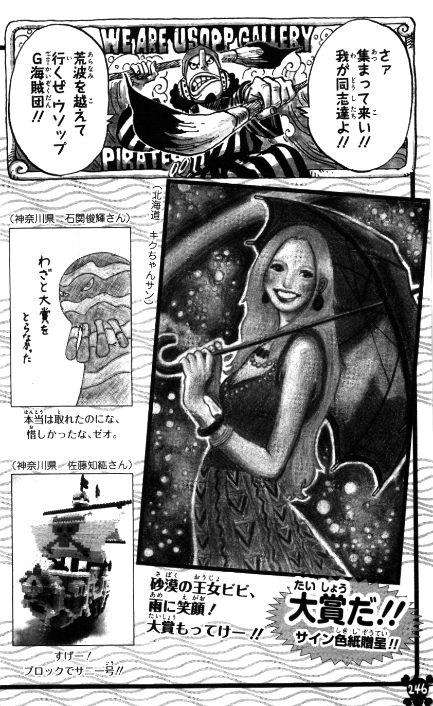 - 680: Начальник G-5: "Бамбуковый демон" Верго (海軍 G-5 基地長 鬼竹のヴェルゴ Kaigun Jī-Faibu Kichichō: Kichiku no Verugo?): Мугивары и Кин’эмон едут на спине Коричневой Бороды в строение B. Перед ними Тасиги и ее люди атакованы меньшим драконом. Дозорные рады появлению Верго, но он использует Сиган на своих союзниках.