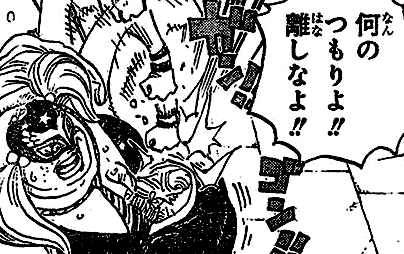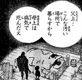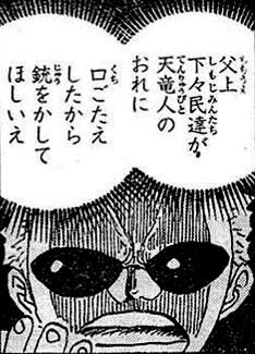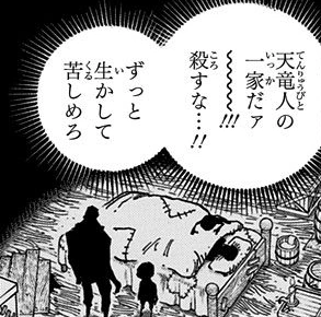 Глава 760, страница 13. Пузырь со словами содержит изменение речи молодого Дофламинго: 「父上…こんな汚い場所で暮らすから母上は病気で死んだえ」(досл. Отец.. Это из-за того, что мы живем в такой дыре, мама умерла) на разговор окружающих людей「天竜他人の一家だァ〜〜!!!殺すな…!!ずっと生かして苦しめろ」(досл. Это семья Тэнрюбито~~!!! Не убивайте их…!! Оставьте в живых и заставьте страдать) |