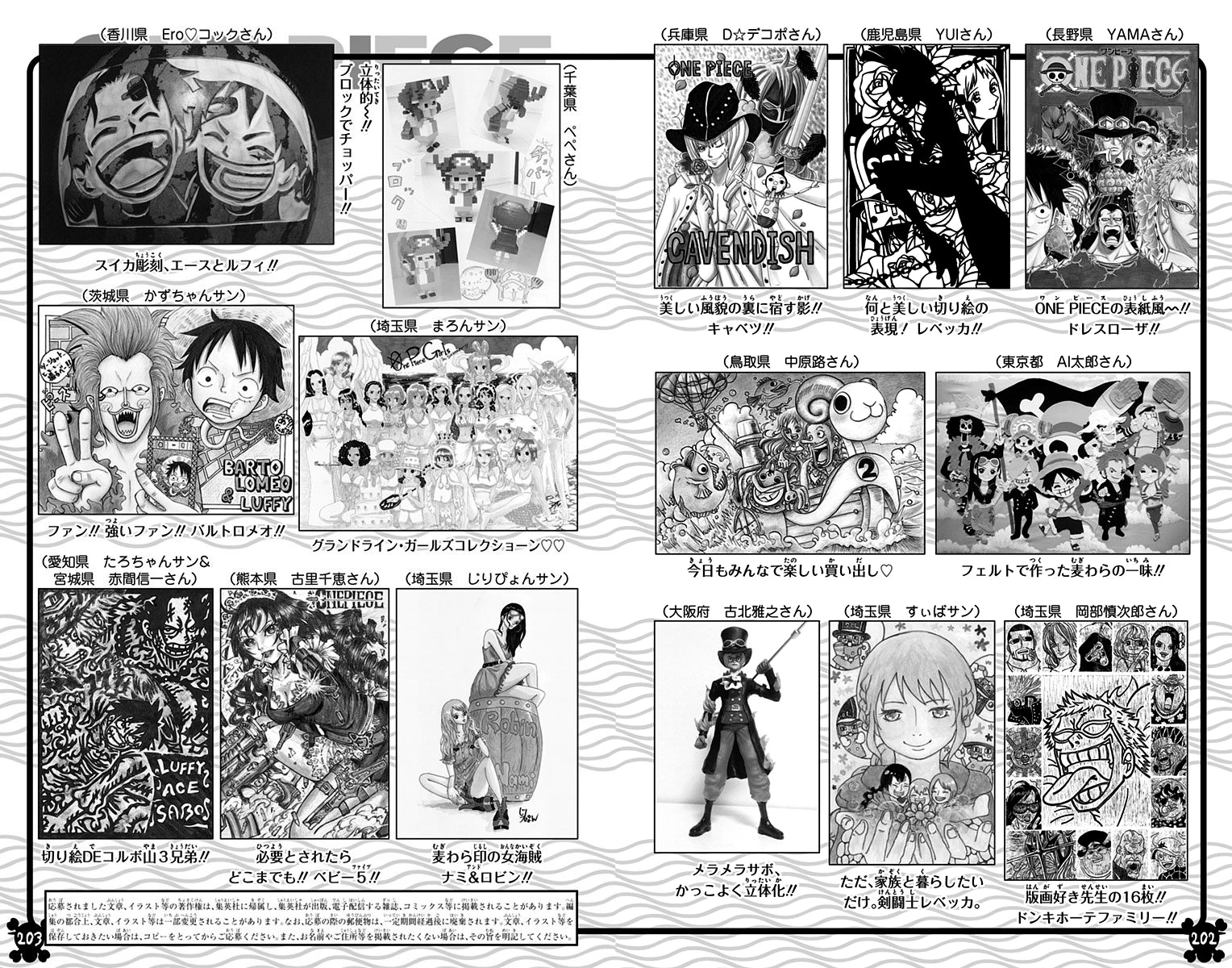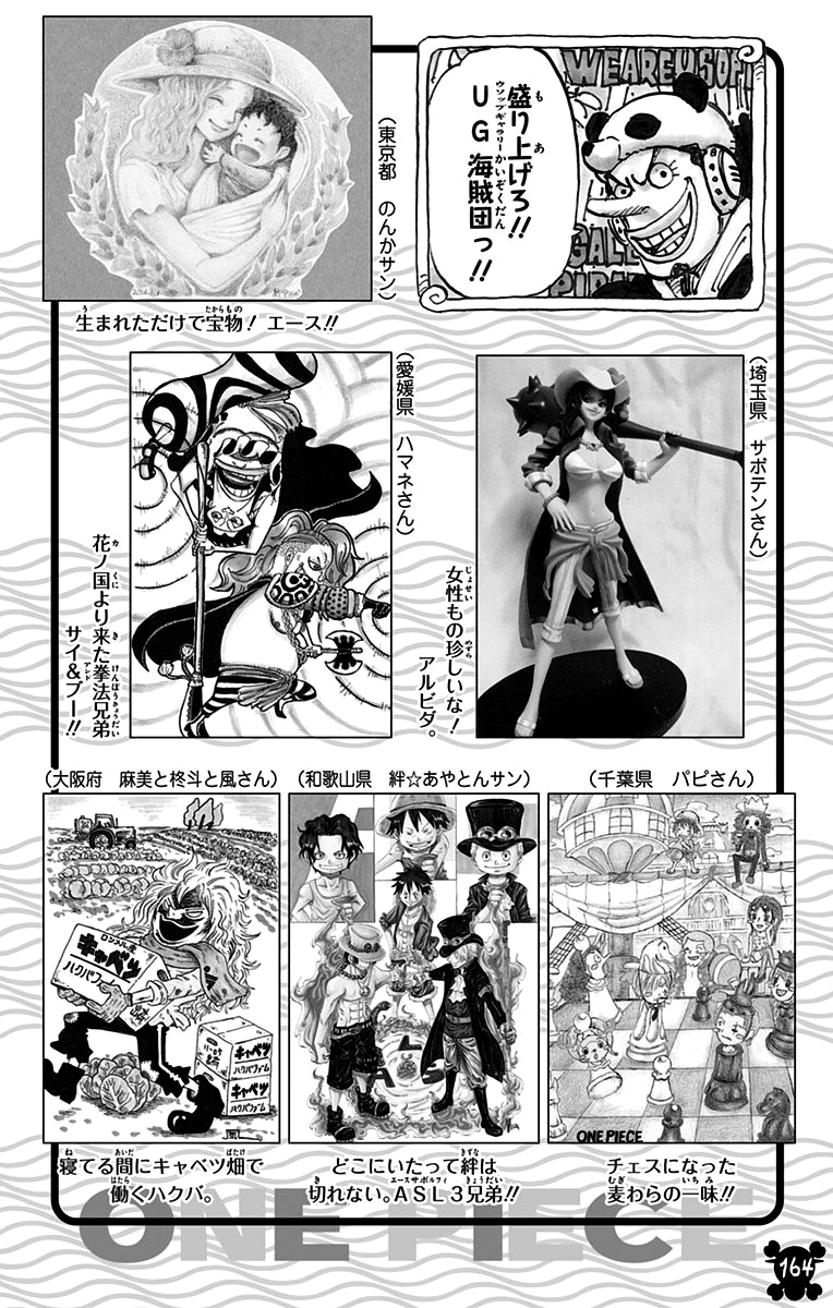 На переднем плане персонажи образуют радужную спираль, в середине которой Луффи и Ло. Идя по часовой стрелке представлены персонажи: Сабо (его лицо растягивает Коала), Кавендиш, Фарул, Кандзюро, Кирос, Зоро, Робин, Бартоломео, Фрэнки, Ребекка и, наконец, Усопп, стреляющей из Куро Кабуто.