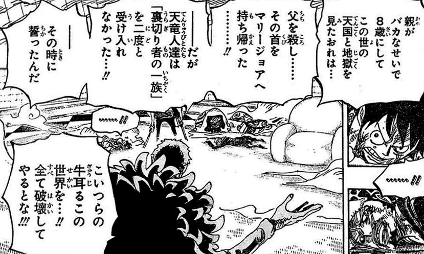 Глава 760, страница 13. Слова Дофламинго изменены с「親がバカなせいで8歳にしてこの世の天国と地獄を見たおれは… 父を殺し……その首をマリージョアへ持ち帰った……!!ーーだが天竜人達は「裏切り者の一族」を二度と受け入れなかった…!!ーーその時に誓ったんだ こいつらの牛耳るこの世界を…!!全てを破壊してやるとな!!!」(досл. Увидев рай и ад этого мира ребенком восьми лет из-за идиотов-родителей, я… Убил своего отца… и принес его голову обратно на Мариджою…..!! ---и все же Тэнрюбито никогда бы не приняли назад "семью предателя"…!! ---именно тогда я поклялся