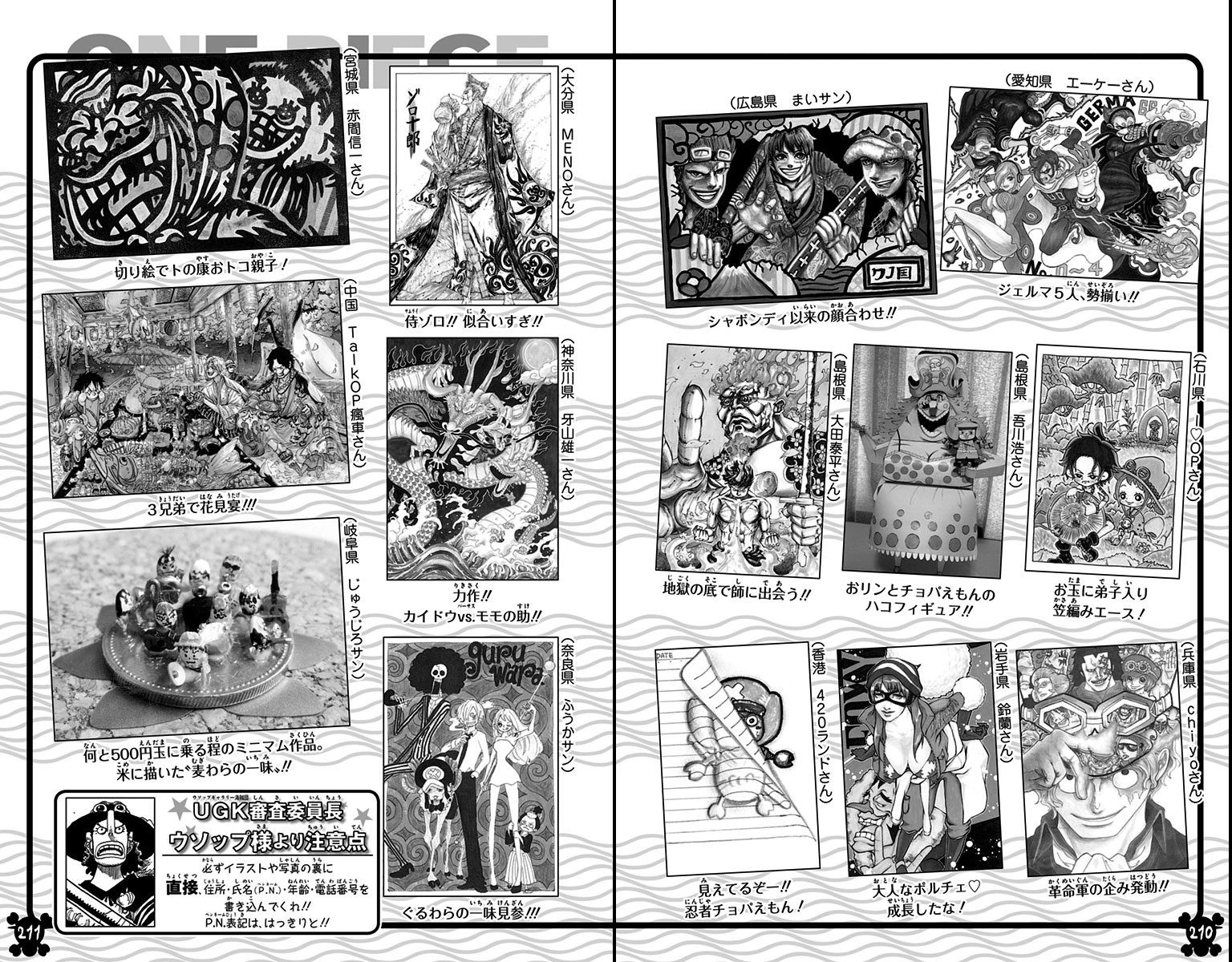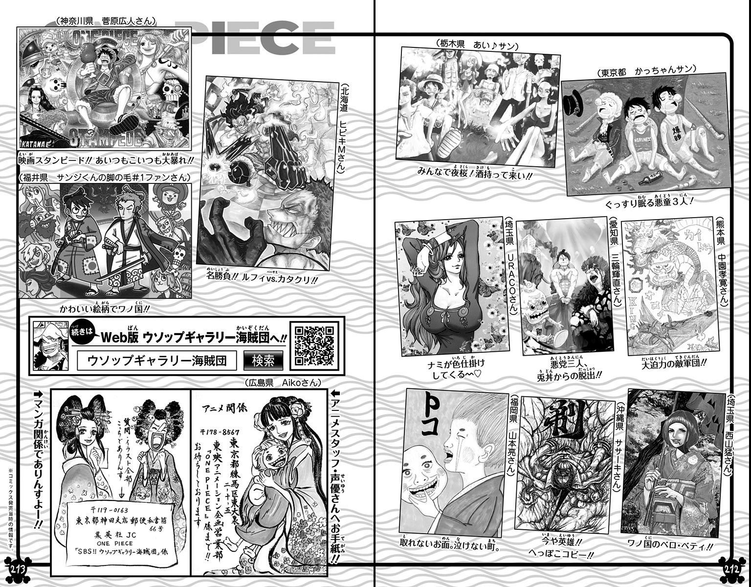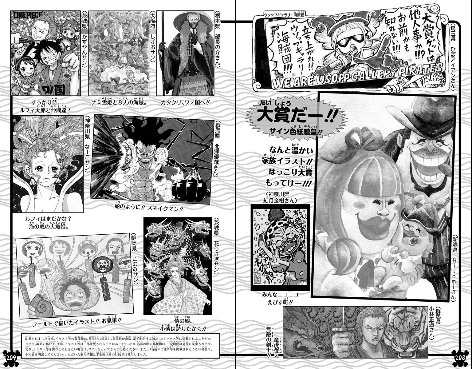 SMILE Сумаиру?): Товарищи Симоцуки Ясуиэ смеются над его смертью, и Кодзуки Хиёри объясняет Зоро, что они не постоянно смеются из того, что Ороти скормил им бракованные плоды SMILE. - 944. Партнёр (相棒 Аибо?): Пираты Соломенной Шляпы сражаются, чтобы защитить Токо и тело Ясуэи. Между тем, Кид и Камадзо возвращены в Шахты заключённых, и раскрыто, что Камадзо это Киллер.