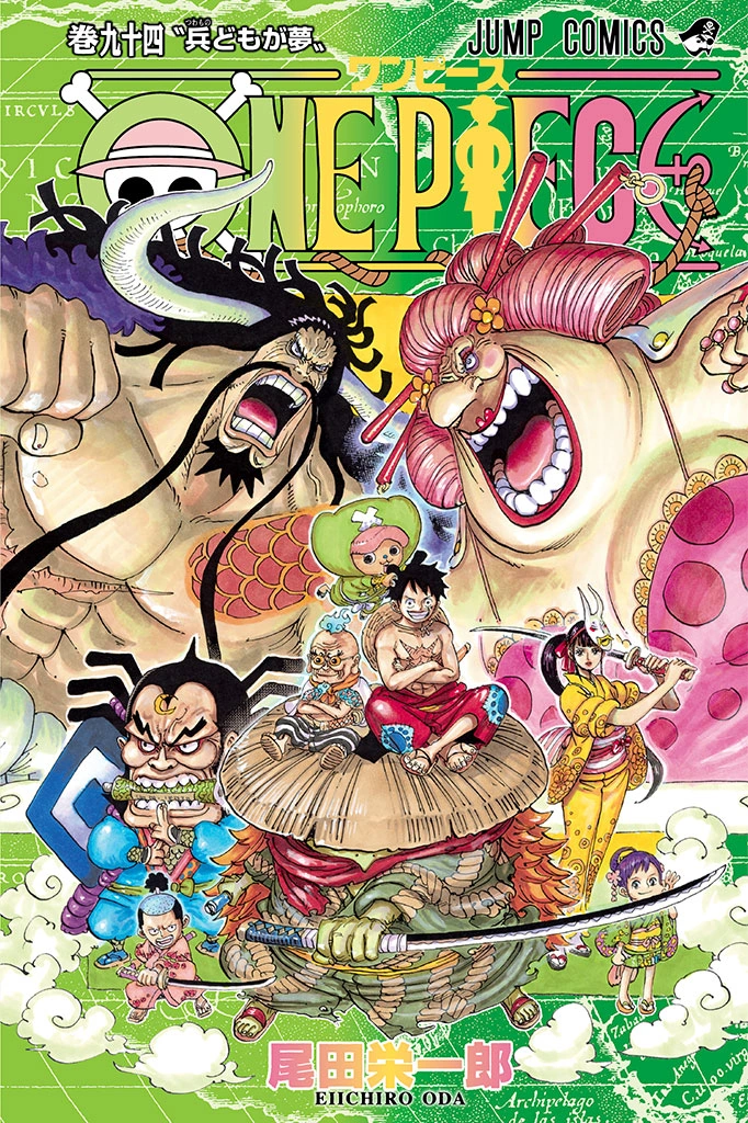 Цвет обложки переходит от светло-зелёного к тёмно-зелёному. Название серии написано светло-зелёным, жёлтыми и розовым градиентом, а имя автора написано жёлтым и розовым градиентом. На обложке изображены: Биг Мам и Кайдо,который сражаются на заднем плане. На переднем плане (по часов стрелке) с правой стороны: Кодзуки Момоносукэ и Райдзо; в центре: Хёгоро, Тони Тони Чоппер и Монки Д. Луффи сидящие сверху на шляпе Кавамацу, который держит Сото Мусо; а с левой стороны изображены Кикунодзё и Тама.
