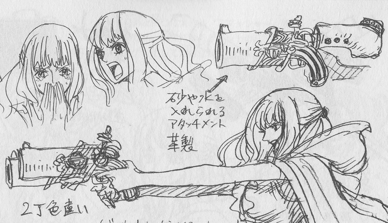 Пистолеты Вспышки (閃光銃(フラッシュガン),Furasshu Gan?): Двухствольные кремневые ружья Брахама с изощренным дизайном и Ракушами Вспышки, установленными внутри, чтобы скрывать пули с помощью вспышек.[4]