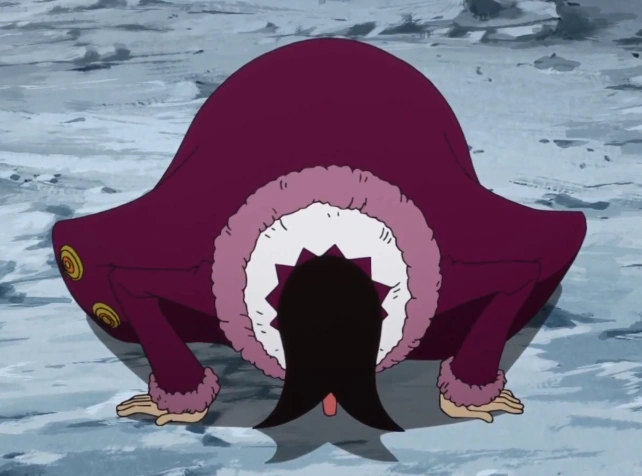 В это время Чоппер, Брук и Тюнтюн-сан убегают от гигантской грибозмеи, однако когда та попадает в огромный капкан, Чоппер спускается, чтобы освободить ее и просит Брука сыграть успокаивающую исцеляющую мелодию. Они ломают ловушку, чем привлекают Морской Дозор. После чего Чоппер обрабатывая раны названной Чоппером "Грибоконды" обнаруживает знакомый запах, который приводит его к оживляющим грибам, которые он искал.