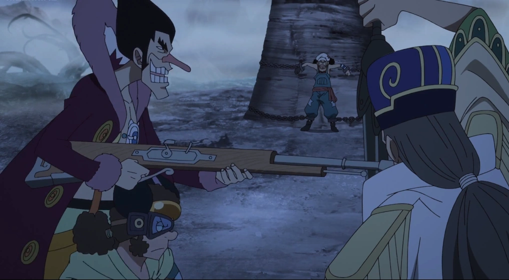 Фокси шокирован когда осознает, что это Кансё пристрелил Луффи, и Комэй раскрывает, что Кансё работал на него все это время, чтобы предать их и убить Луффи в подходящий момент. Нами атакует Комэя с помощью молнии, но тот перенаправляет электрический удар в нее и Фокси, отправляя обоих на землю. После чего на Нами и Фокси надевают наручники, а Морской Дозор празднует победу над Пиратами Соломенной Шляпы.