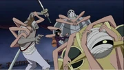 ↑One Piece Манга и Аниме — Том 51Глава 494 и Эпизод 388, Dos Manos применена на Наездниках Летучих Рыб.