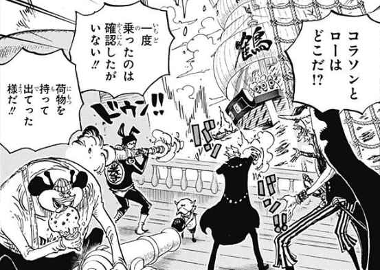 Глава 764 (стр. 11-12) и Эпизод 703, Дофламинго говорит Коразону, что Цуру из Штаба снова пришла за ними, он узнал её линкор.