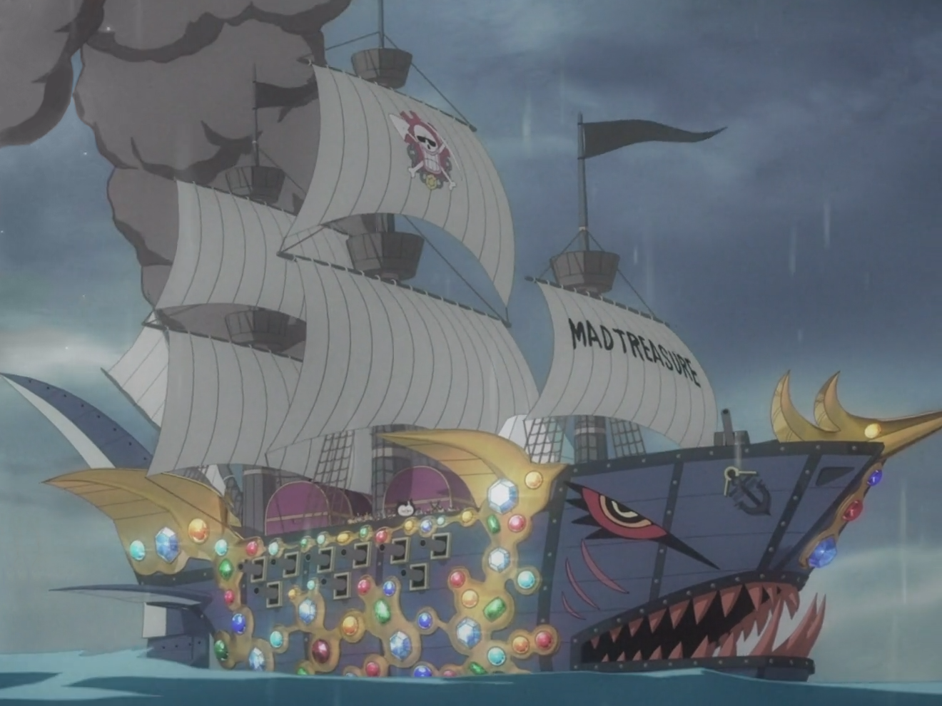 Мэд Трэза и его люди замаскировали корабль, подбираясь к флоту Морского Дозора и вступая с ним в битву. Они потопили флот, но не смогли поймать свою цель, девочку по имени Ольга Мыскина. Корабль вновь был замаскирован, когда Трэза подобрался к новому месту Ольги — корабль Пиратов Соломенной Шляпы, Таузенд Санни. Во время сражения двух команд, Ольга выронила своё кольцо, из-за чего явилась огромная рыба Бонбори и проглотила его. Наблюдая, как Соломенных Шляп вместе с Ольгой засасывает внутрь Бонбори, Трэза решает отправиться за ними. Трэза с помощью Шарк Эмеральды сбил Таузенд Санни, однако вскоре оба корабля попали через горло Бонбори в первый желудок.[1]
